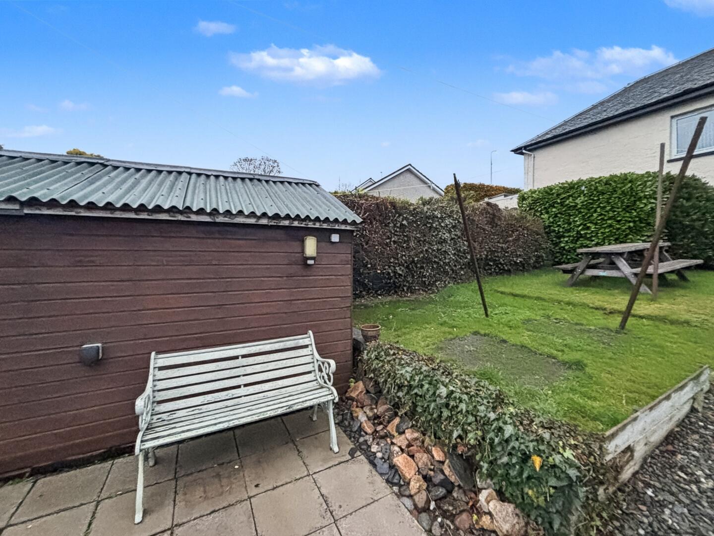 There is a good sized south facing rear garden with a driveway for off street parking. There is also a shed with electricity.