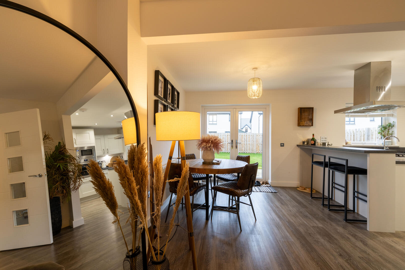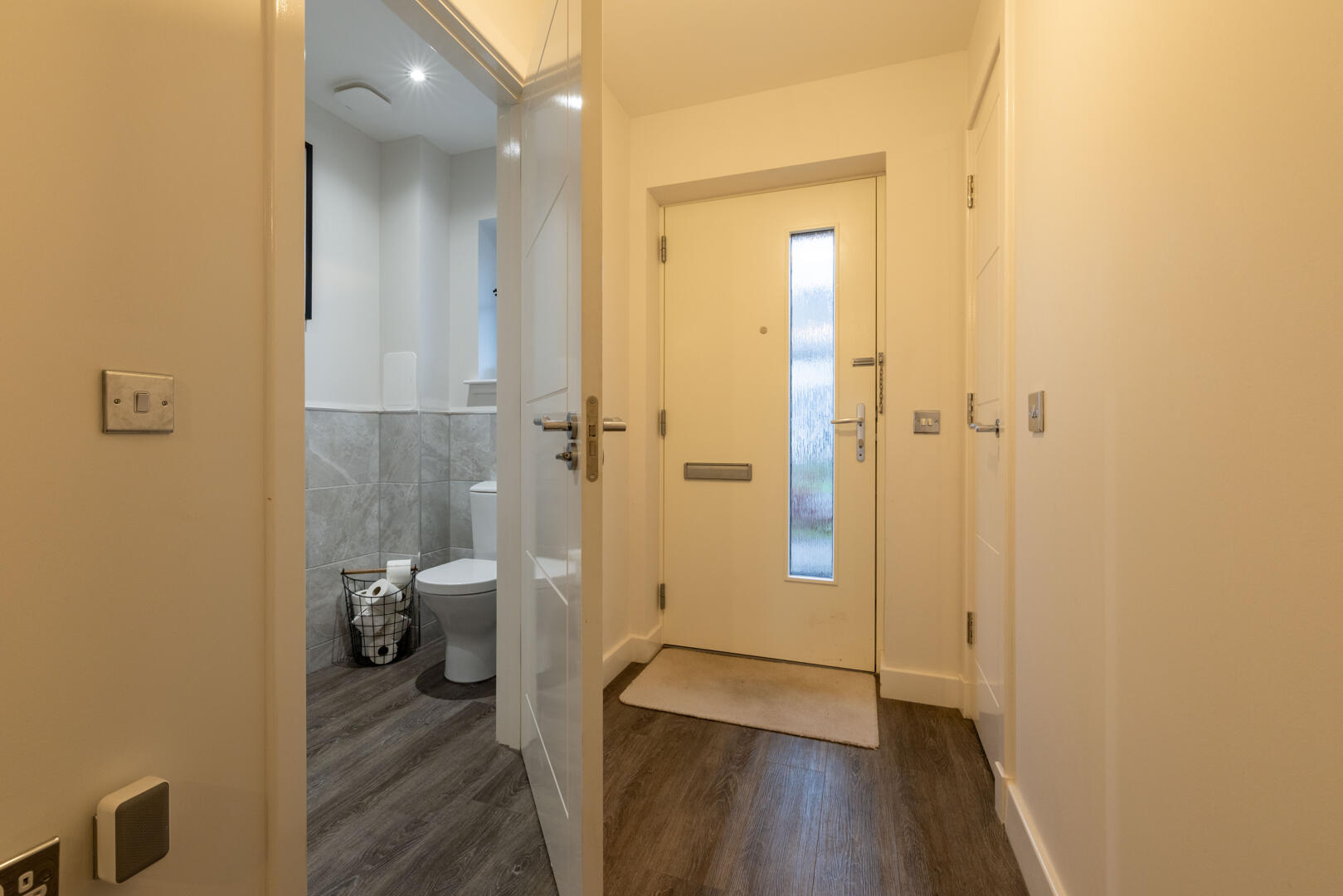 The accommodation is thoughtfully arranged over two levels. On the ground floor, a welcoming entrance hall leads to a spacious lounge, which flows seamlessly into a contemporary open-plan kitchen/diner. The kitchen is fully equipped with integrated appliances and enjoys direct access to the rear garden via double doors, making it ideal for both everyday living and entertaining. A convenient W.C. completes the ground floor.