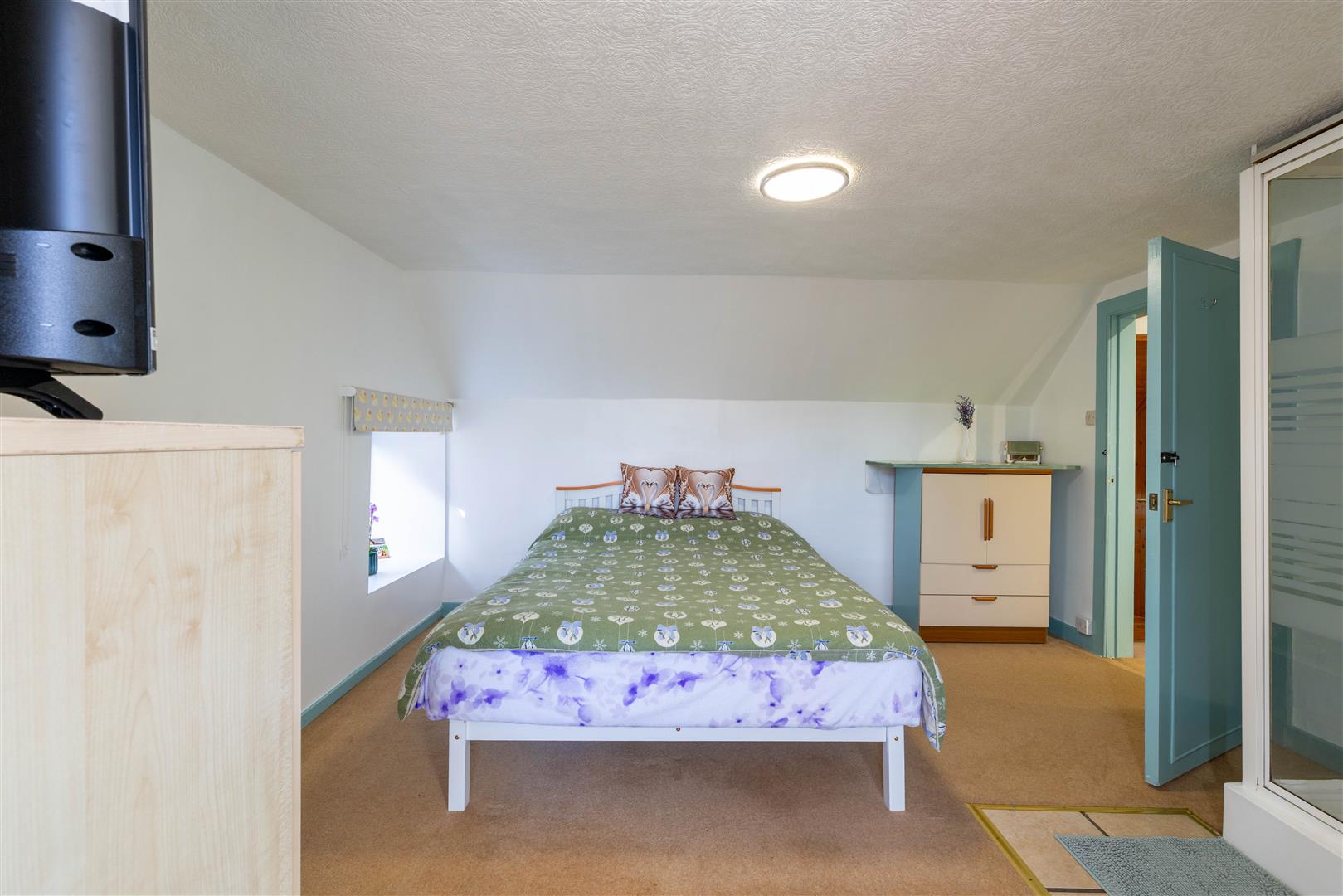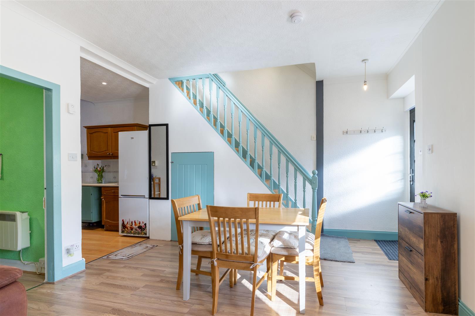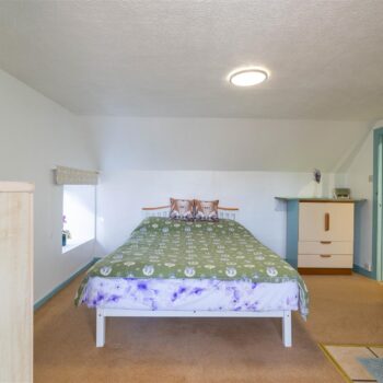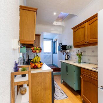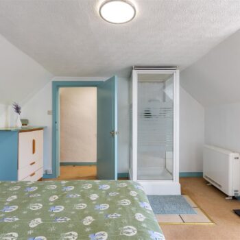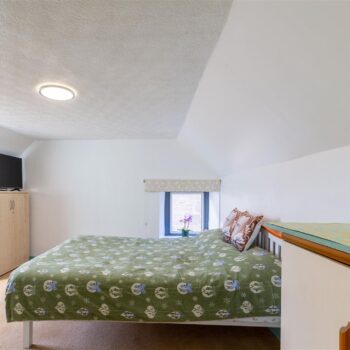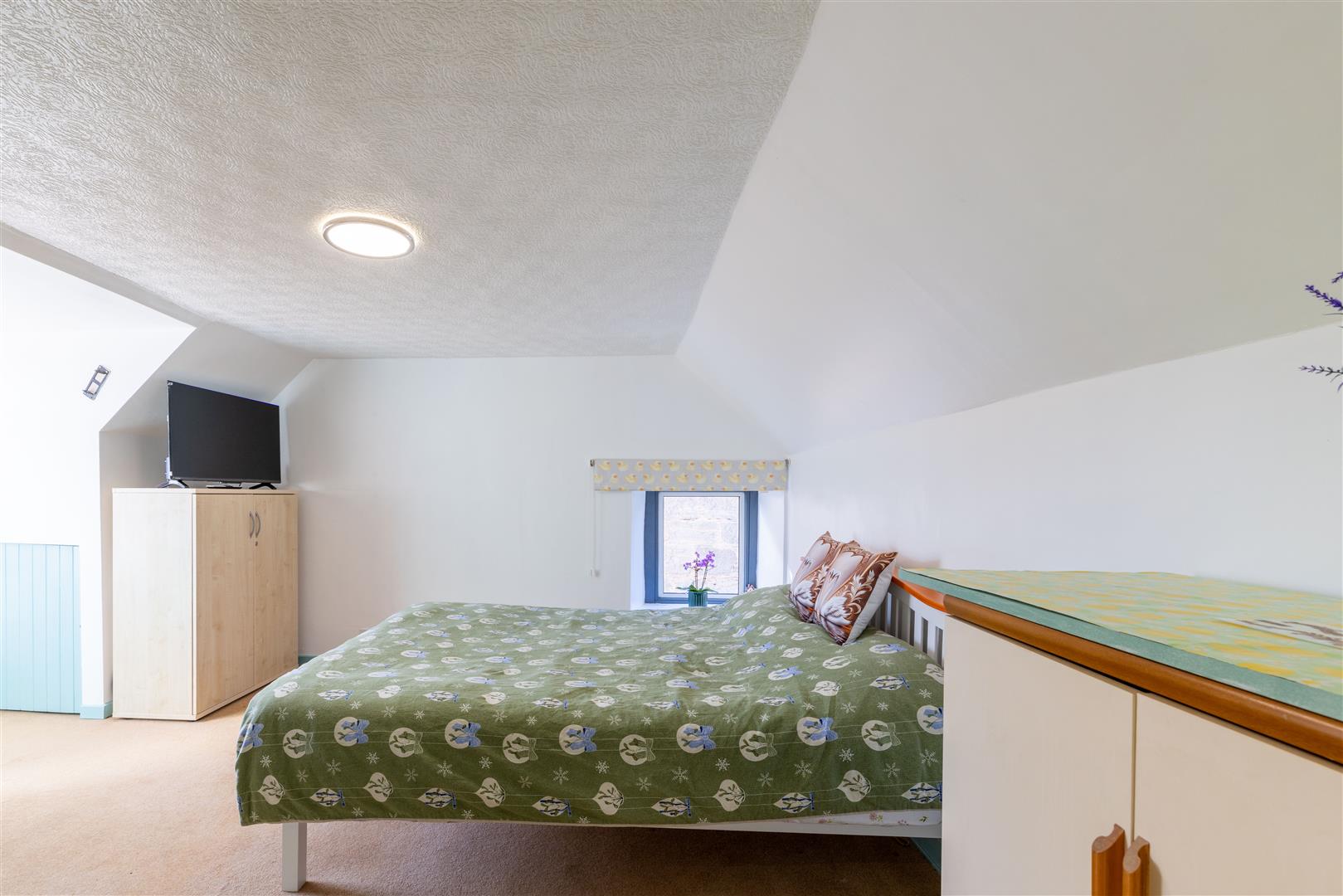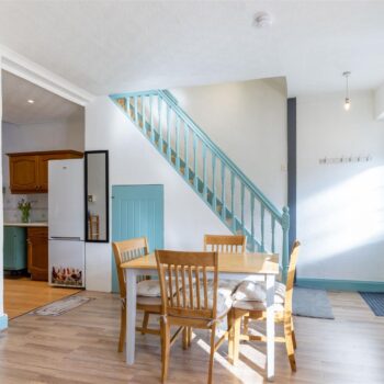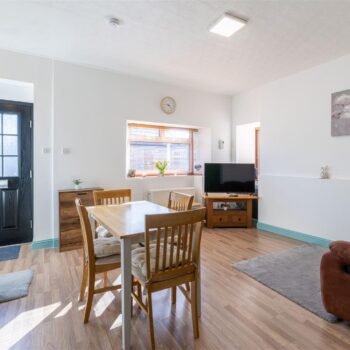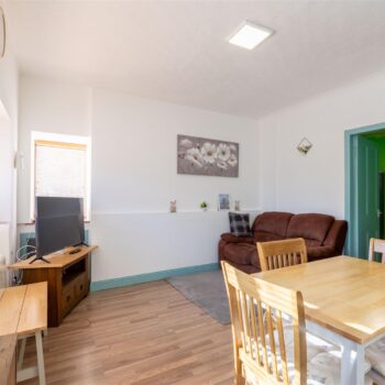 The property is set over two levels and comprises an open-plan living and dining area, kitchen, bathroom, and a well-proportioned ground-floor bedroom. The upper level hosts a further generously sized bedroom.