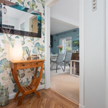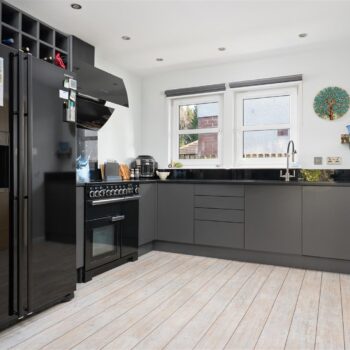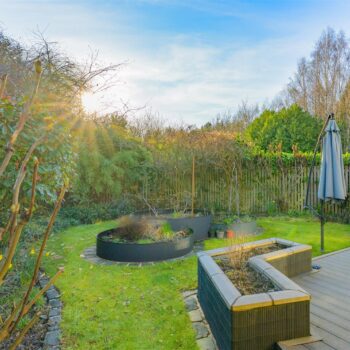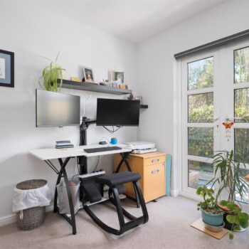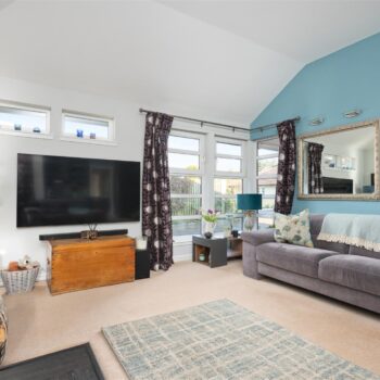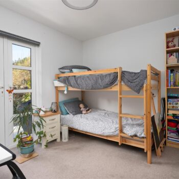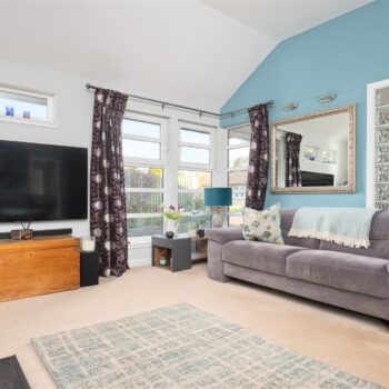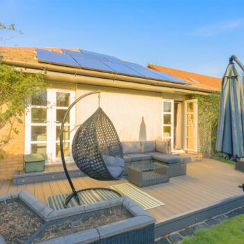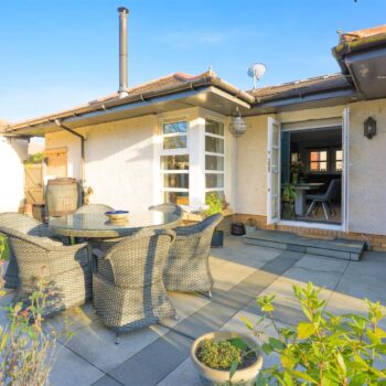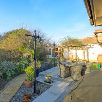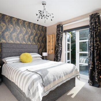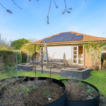 There are three generously sized double bedrooms, with the principal bedroom benefiting from a newly fitted en-suite. All bedrooms feature patio doors opening onto the garden, allowing natural light to flood the interiors. A beautifully appointed family bathroom completes the accommodation. The property further benefits from excellent storage throughout, gas central heating, and double glazing.