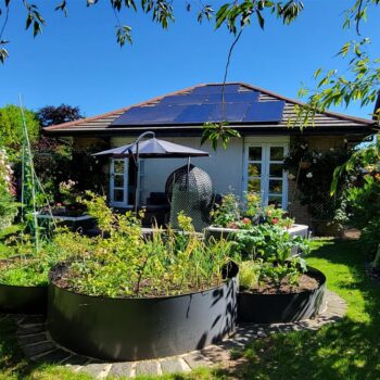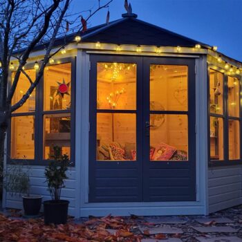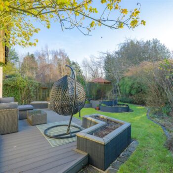 Externally, the home enjoys a 'tucked away' position, offering a high degree of privacy. The wraparound gardens are comprised of mature borders and lawn, complemented by a patio and decked area—ideal for outdoor entertaining and summer relaxation. A well-equipped summer house with power provides additional versatile space. Off-street parking is available via a driveway leading to a garage.