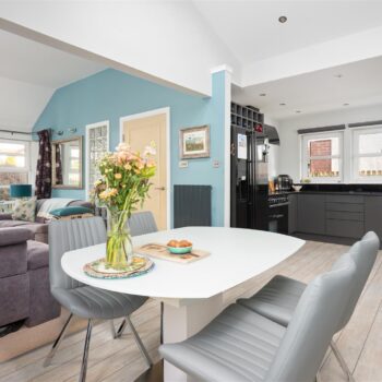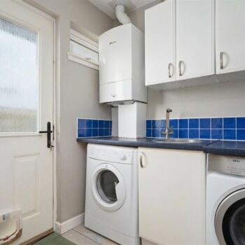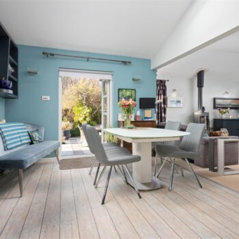Arranged over a single level, the accommodation comprises a welcoming entrance hall, a convenient W.C., and a bright and spacious living room featuring a wood-burning stove. This space flows seamlessly into the dining area, which enjoys direct access to the garden, and a modern kitchen complete with integrated appliances. A separate utility room adds further practicality.