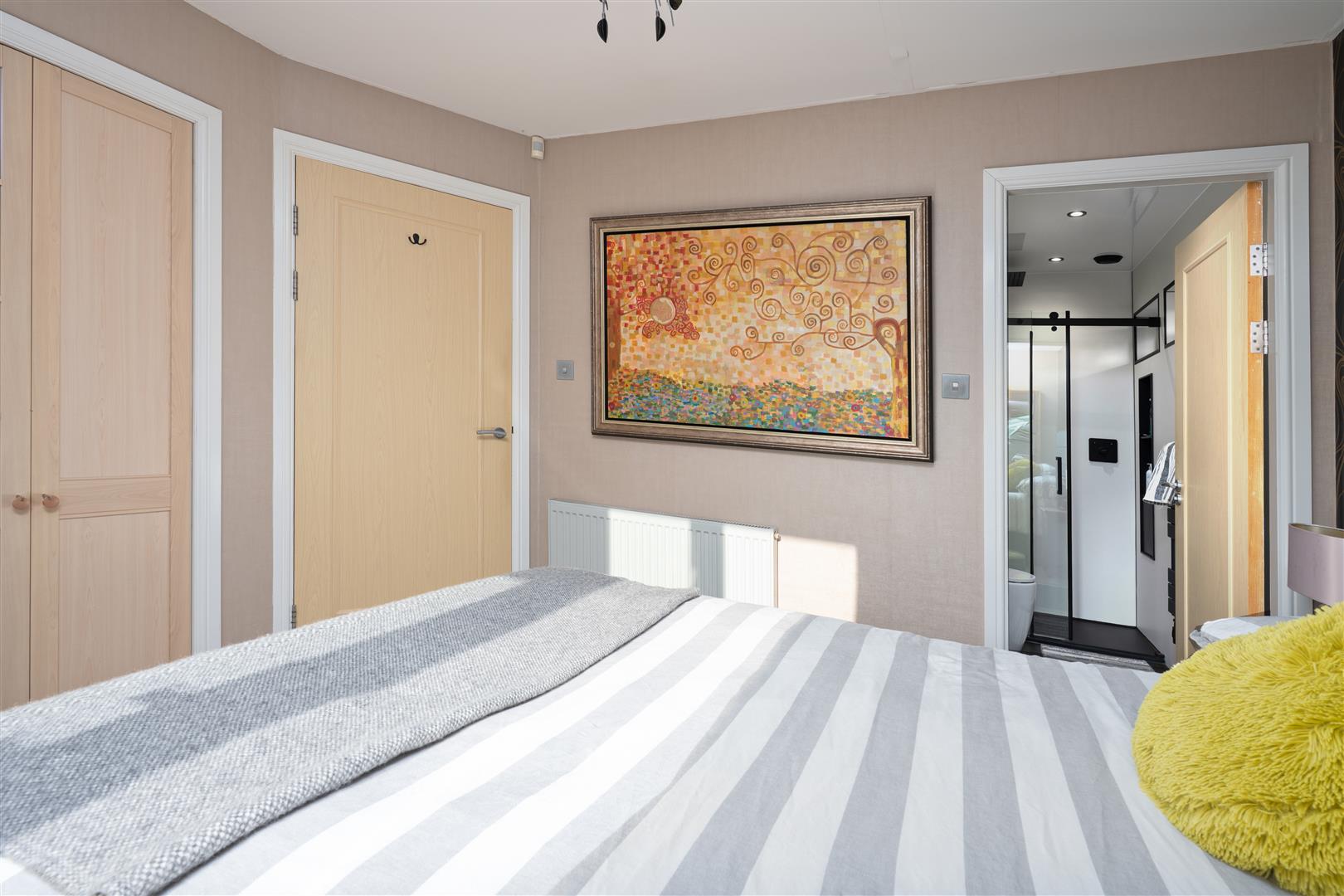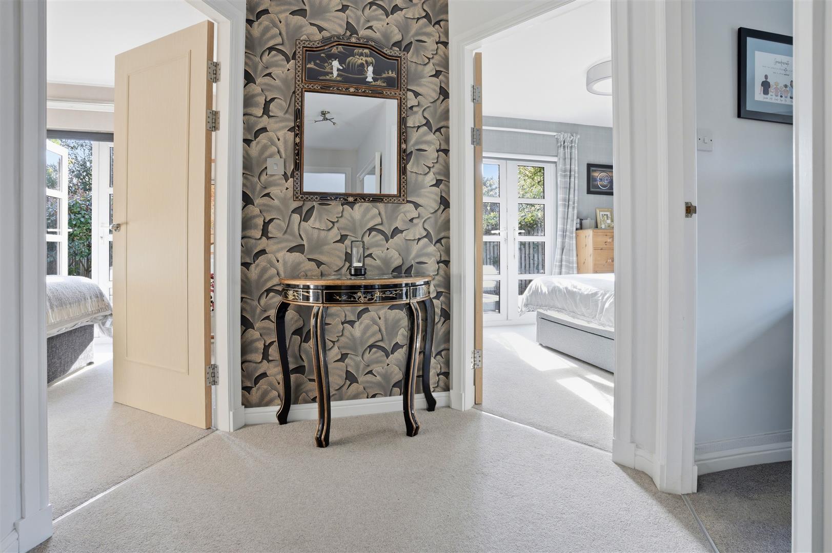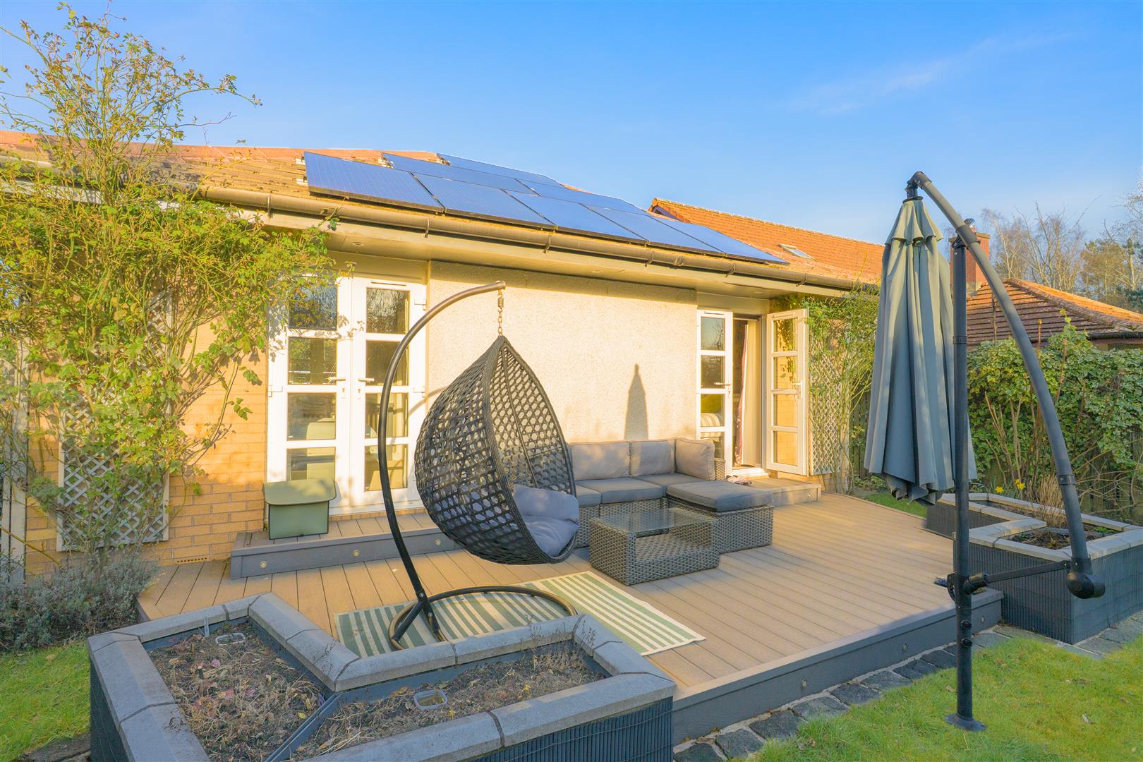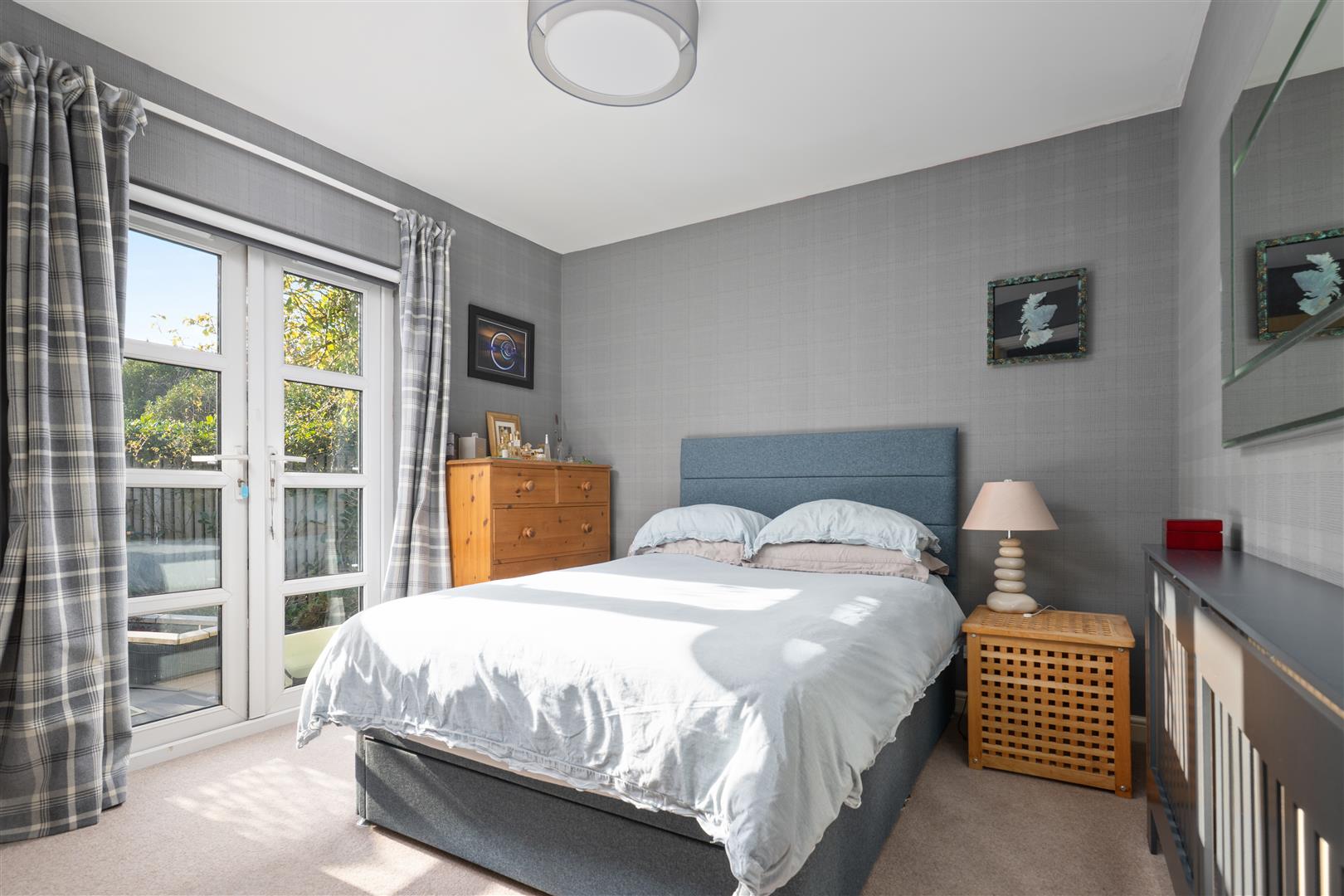 There are three generously sized double bedrooms, with the principal bedroom benefiting from a newly fitted en-suite. All bedrooms feature patio doors opening onto the garden, allowing natural light to flood the interiors. A beautifully appointed family bathroom completes the accommodation. The property further benefits from excellent storage throughout, gas central heating, and double glazing.