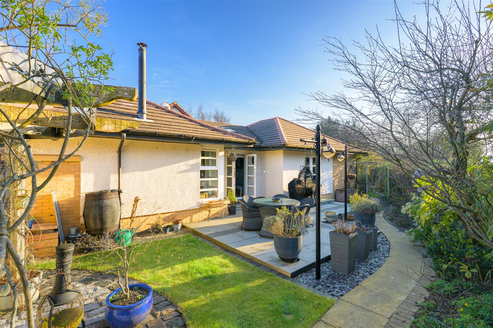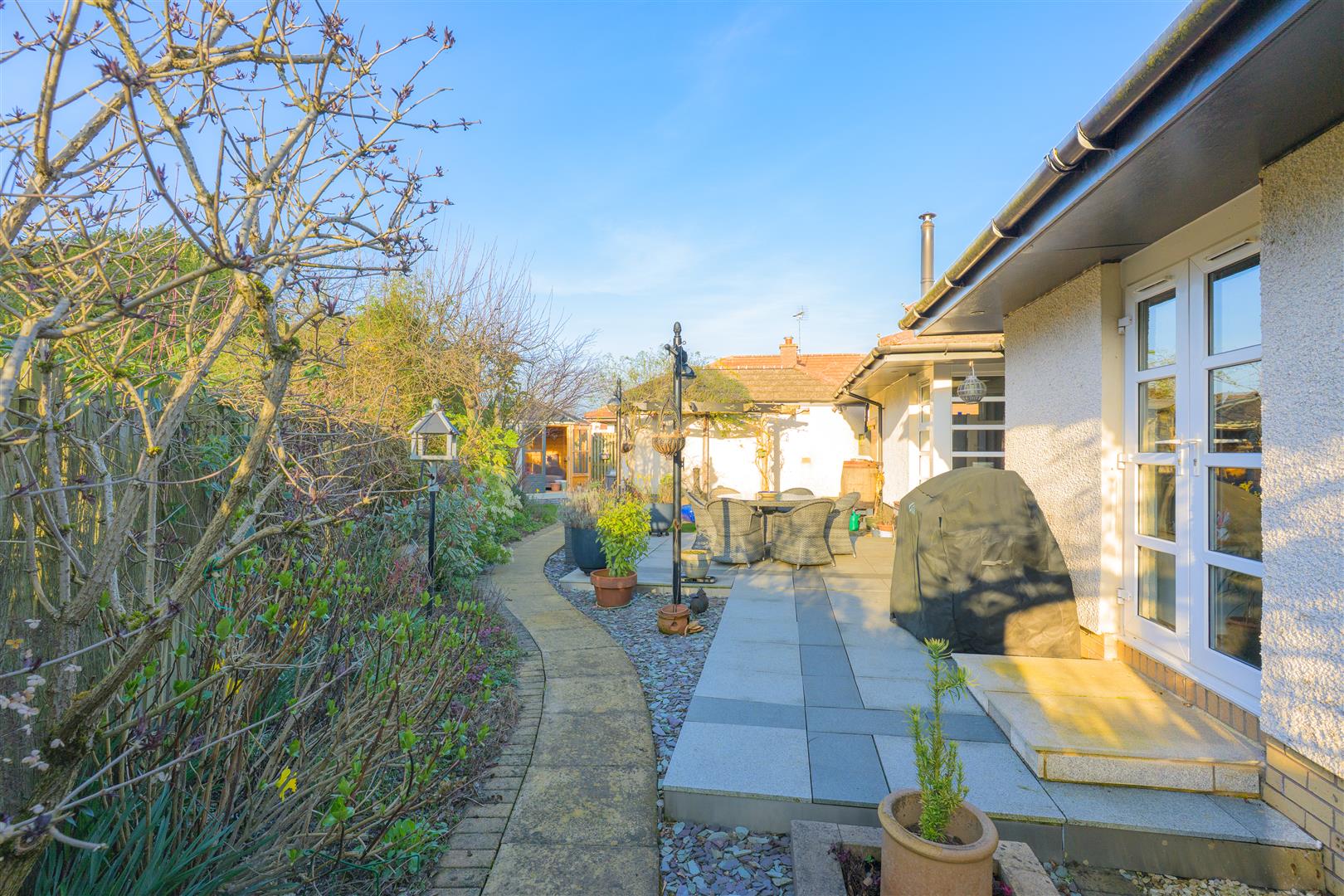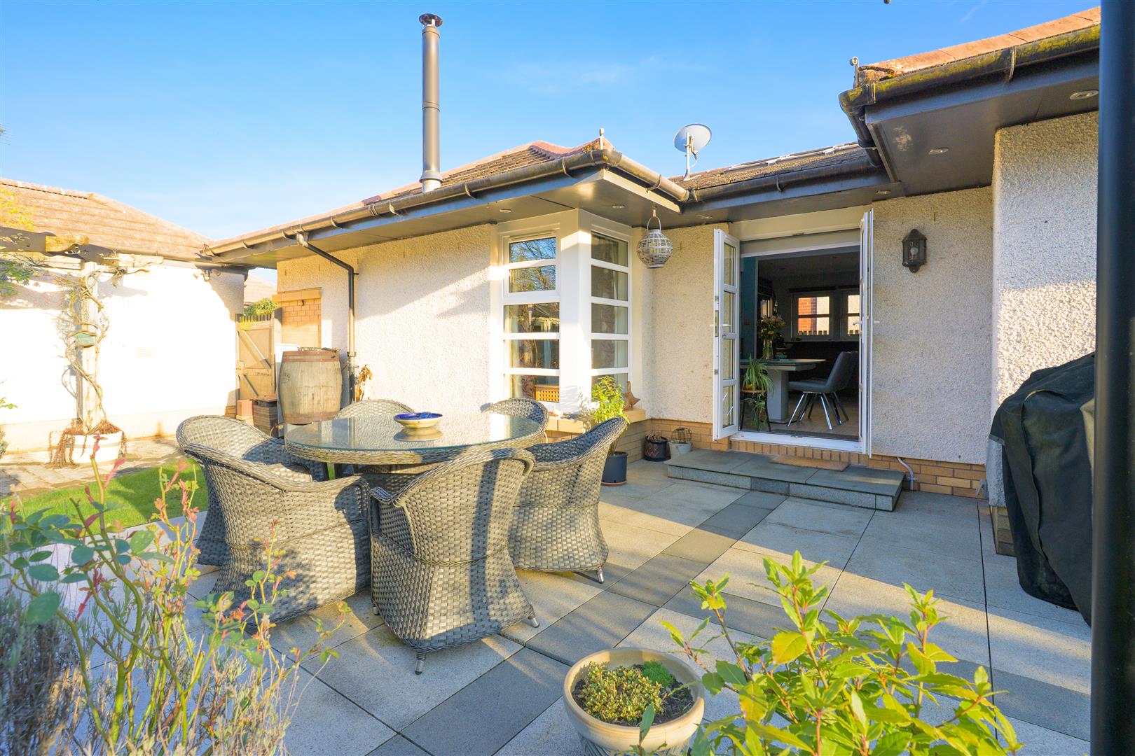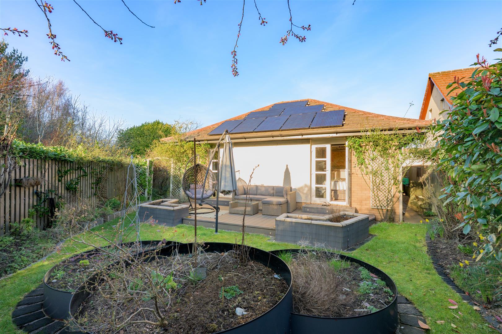 There are three generously sized double bedrooms, with the principal bedroom benefiting from a newly fitted en-suite. All bedrooms feature patio doors opening onto the garden, allowing natural light to flood the interiors. A beautifully appointed family bathroom completes the accommodation. The property further benefits from excellent storage throughout, gas central heating, and double glazing.