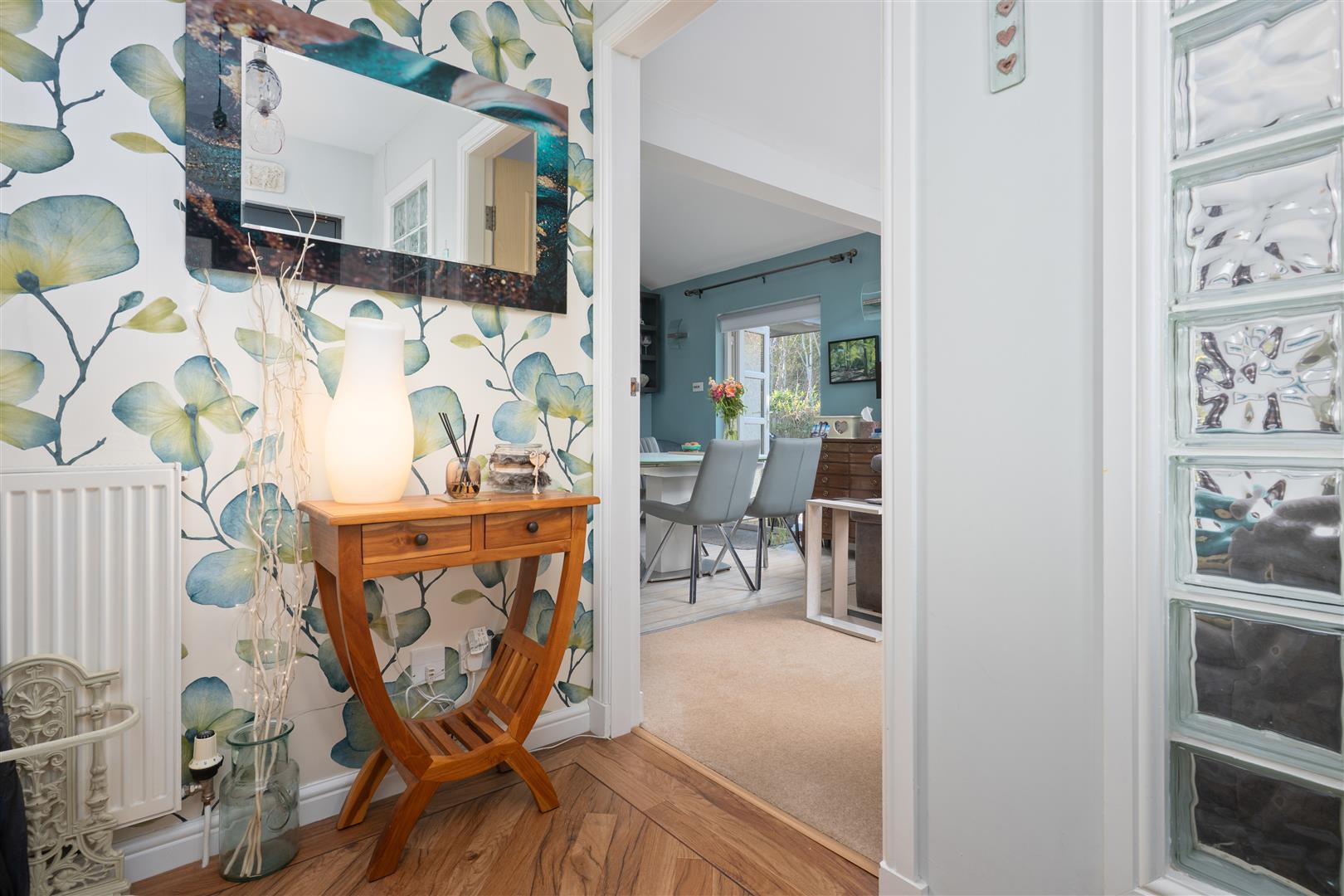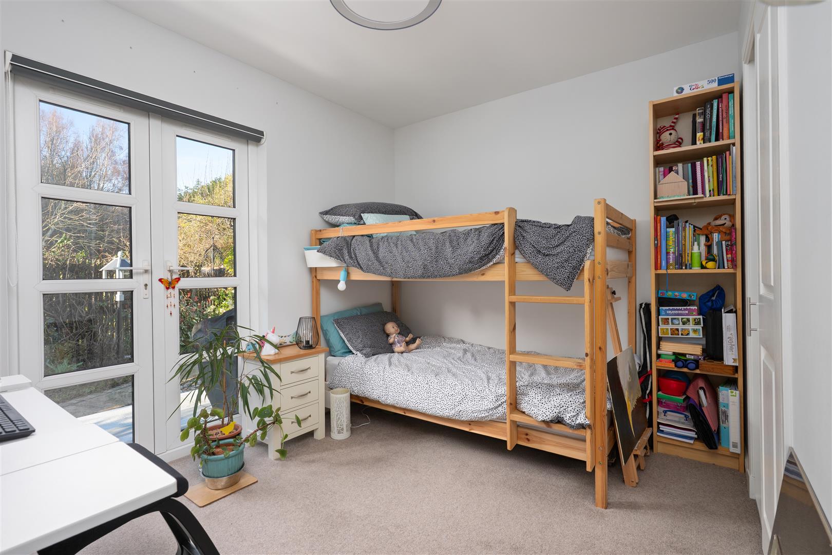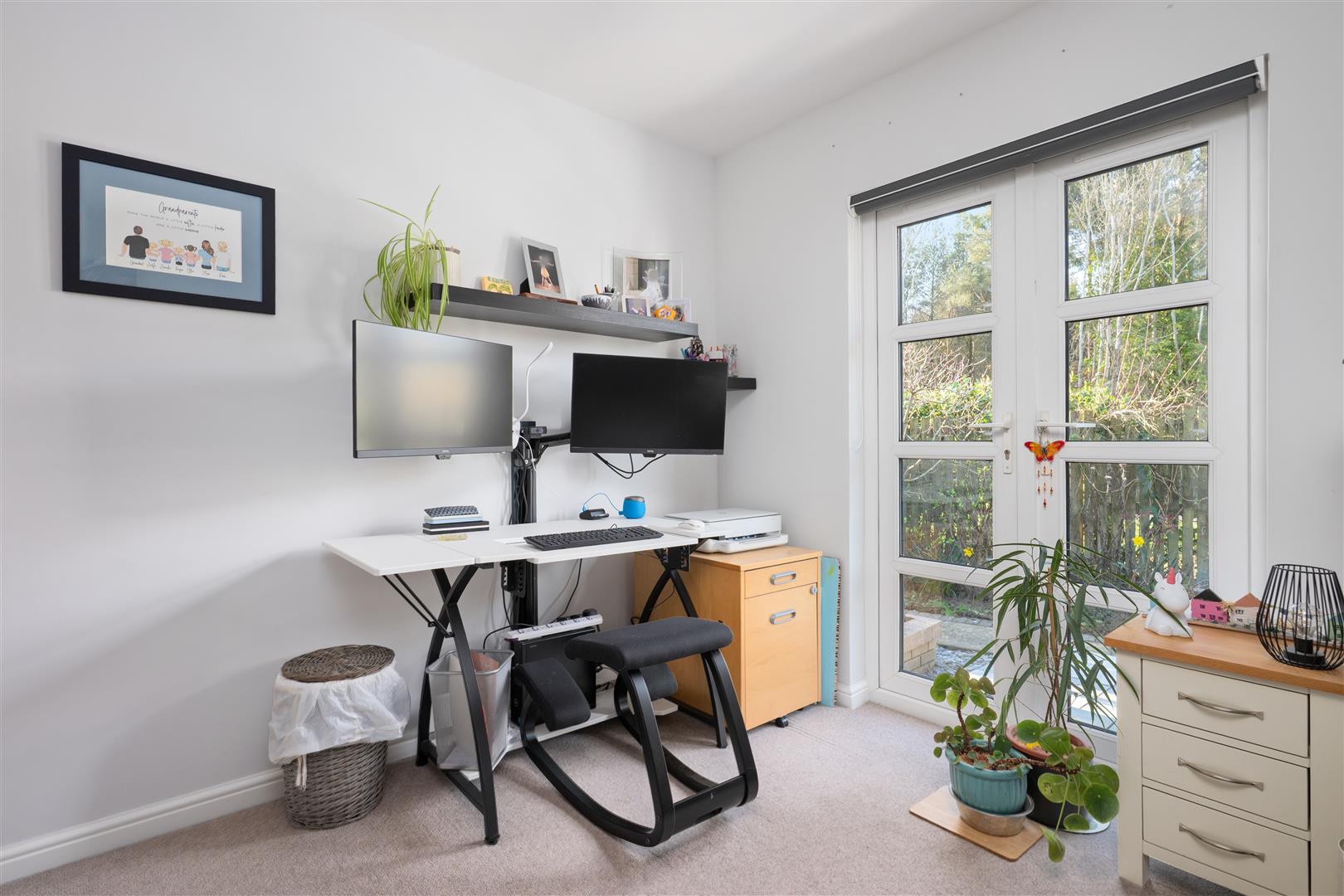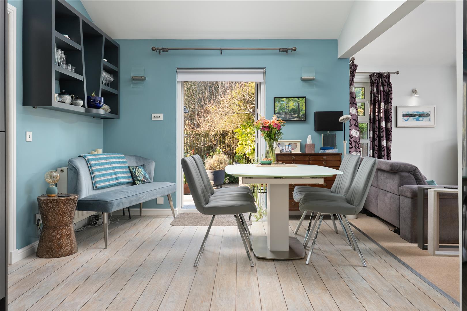 There are three generously sized double bedrooms, with the principal bedroom benefiting from a newly fitted en-suite. All bedrooms feature patio doors opening onto the garden, allowing natural light to flood the interiors. A beautifully appointed family bathroom completes the accommodation. The property further benefits from excellent storage throughout, gas central heating, and double glazing.
