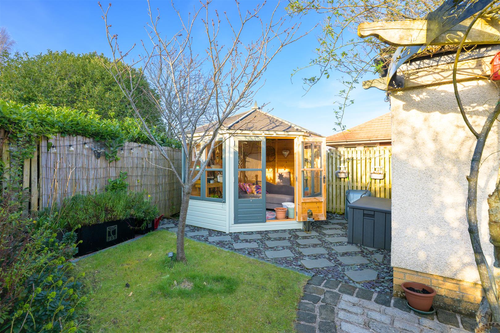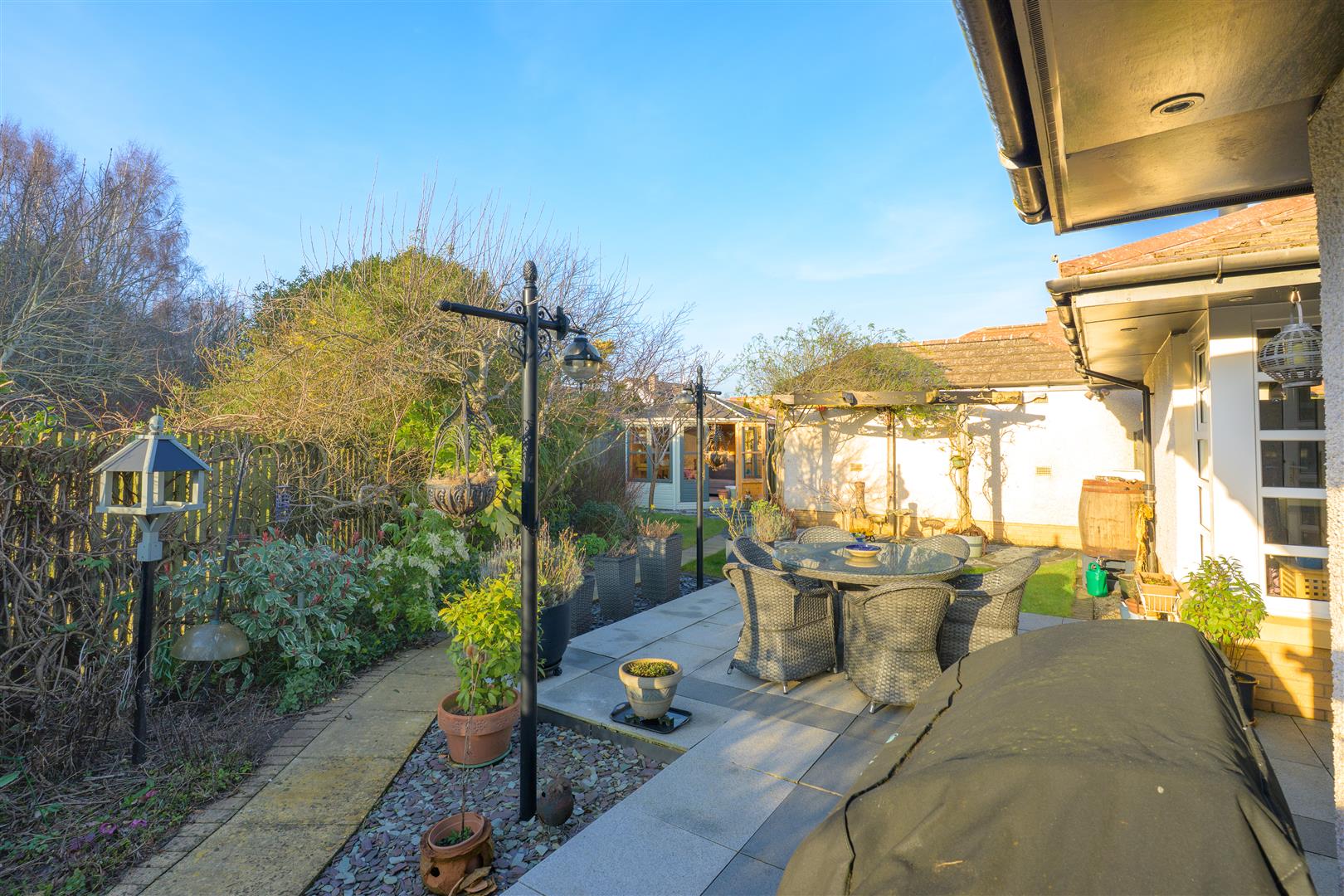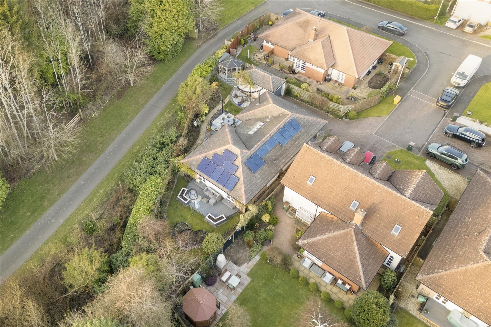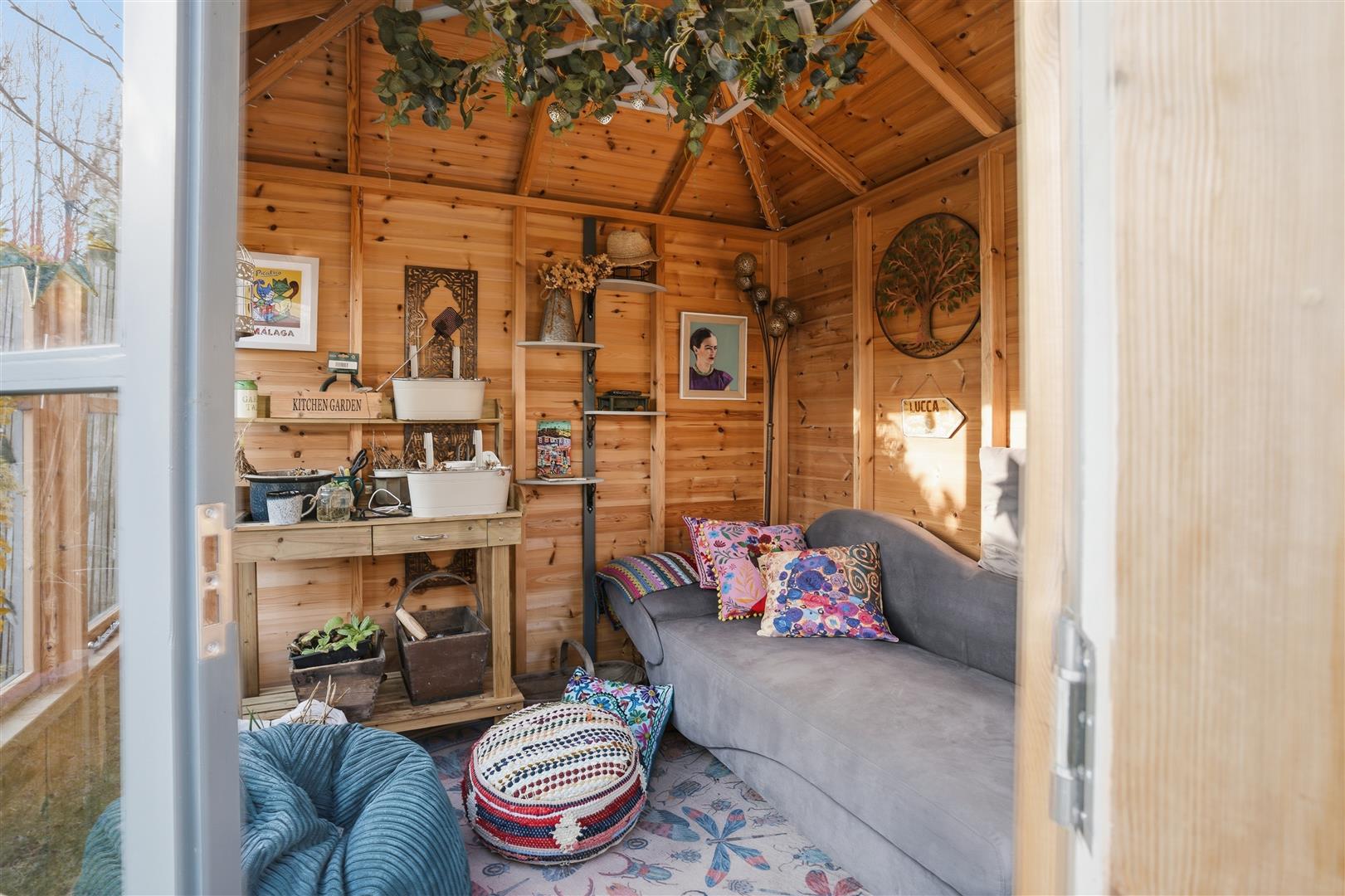 Externally, the home enjoys a 'tucked away' position, offering a high degree of privacy. The wraparound gardens are comprised of mature borders and lawn, complemented by a patio and decked area—ideal for outdoor entertaining and summer relaxation. A well-equipped summer house with power provides additional versatile space. Off-street parking is available via a driveway leading to a garage.