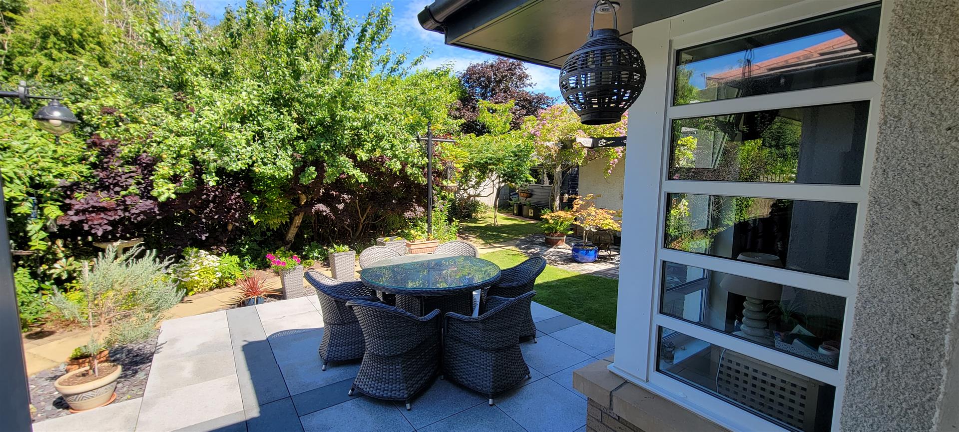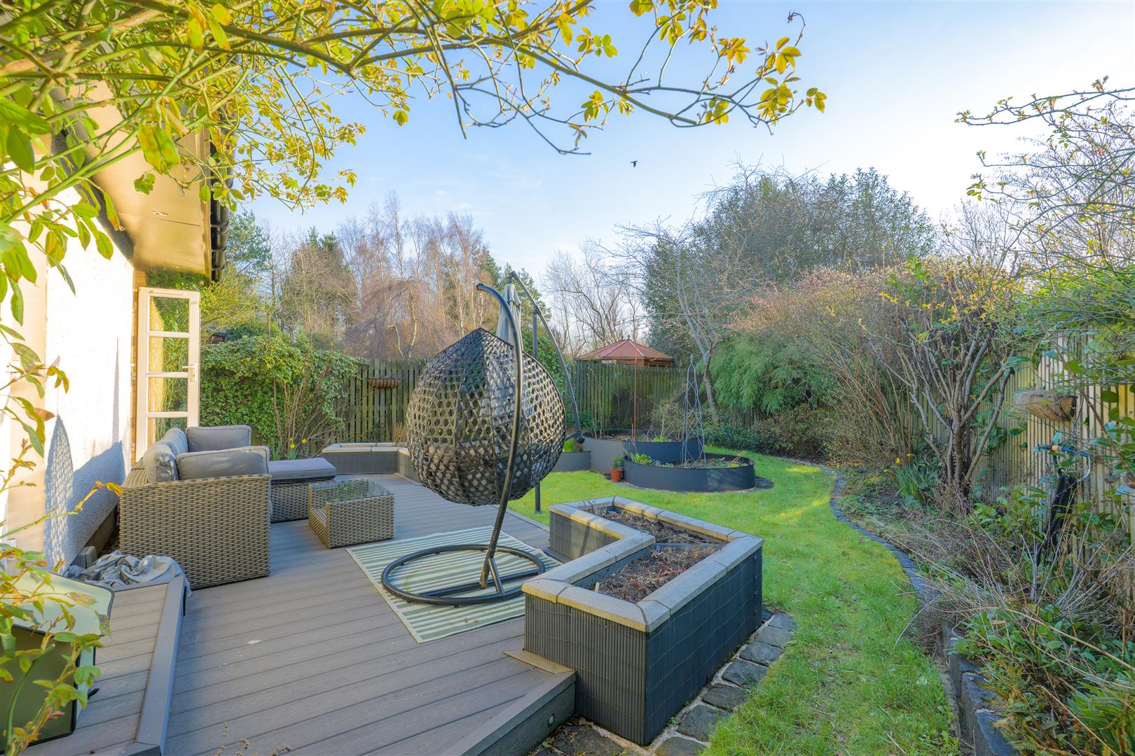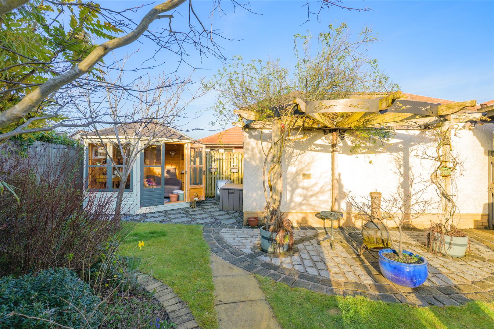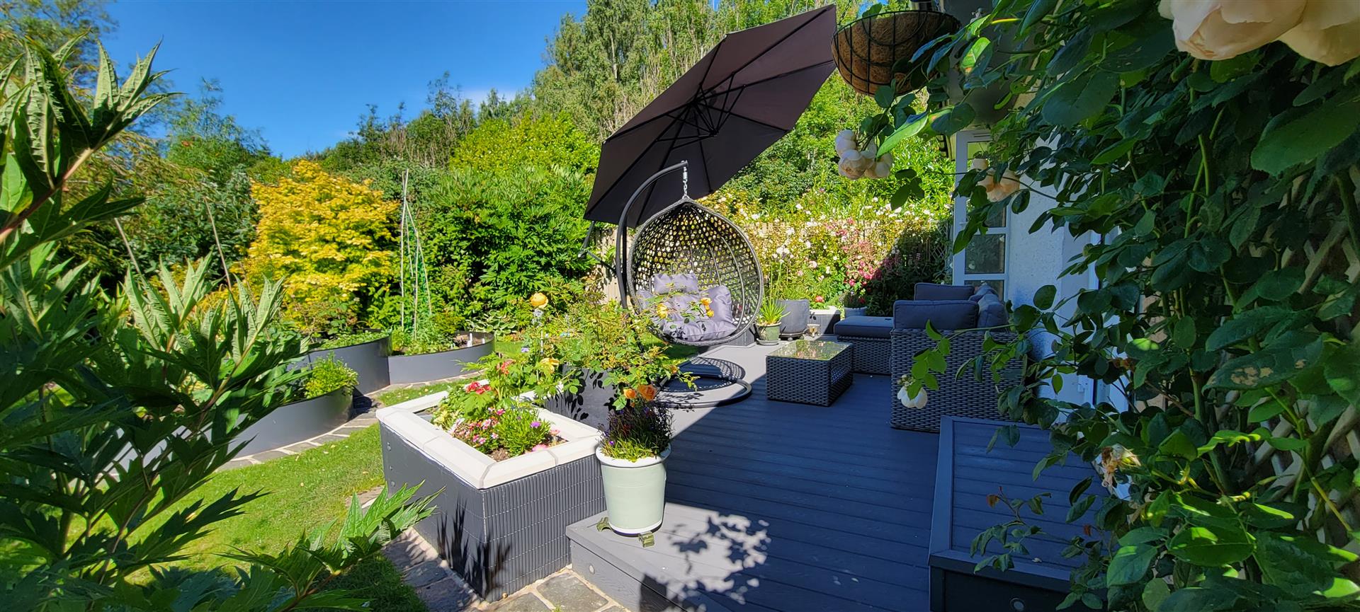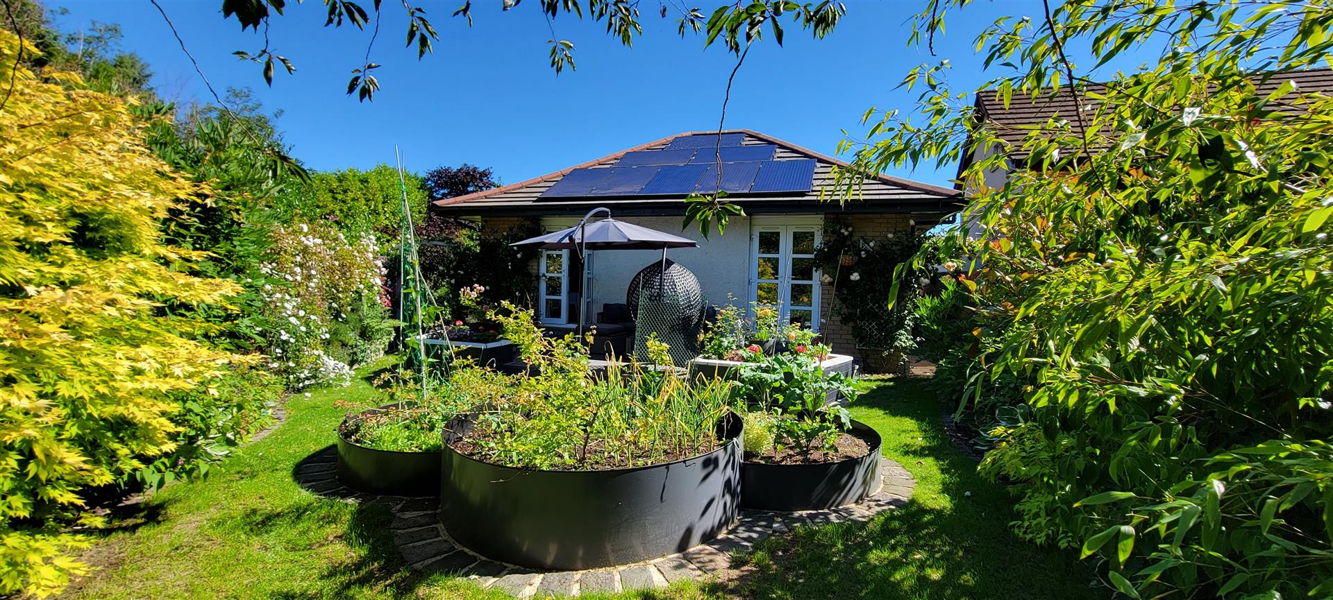 Externally, the home enjoys a 'tucked away' position, offering a high degree of privacy. The wraparound gardens are comprised of mature borders and lawn, complemented by a patio and decked area—ideal for outdoor entertaining and summer relaxation. A well-equipped summer house with power provides additional versatile space. Off-street parking is available via a driveway leading to a garage.