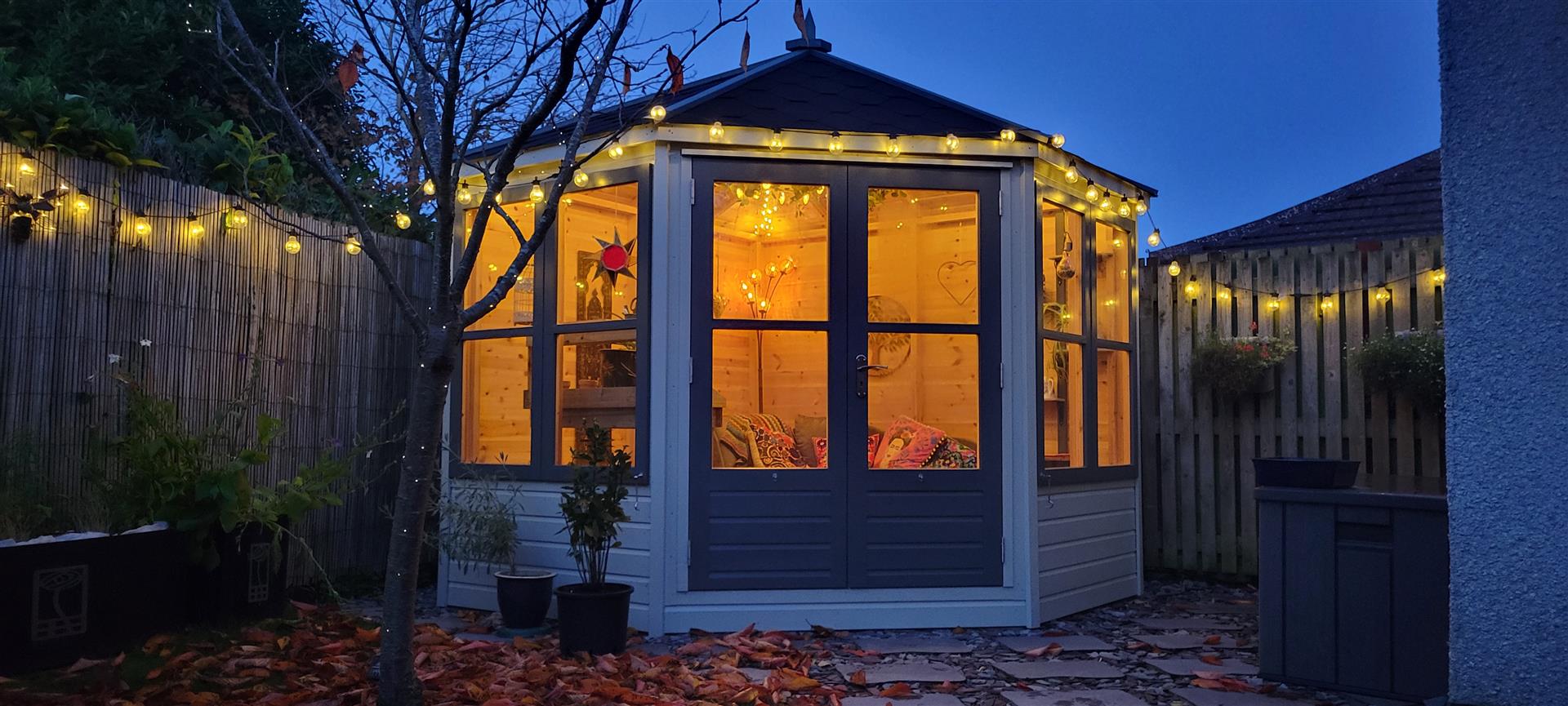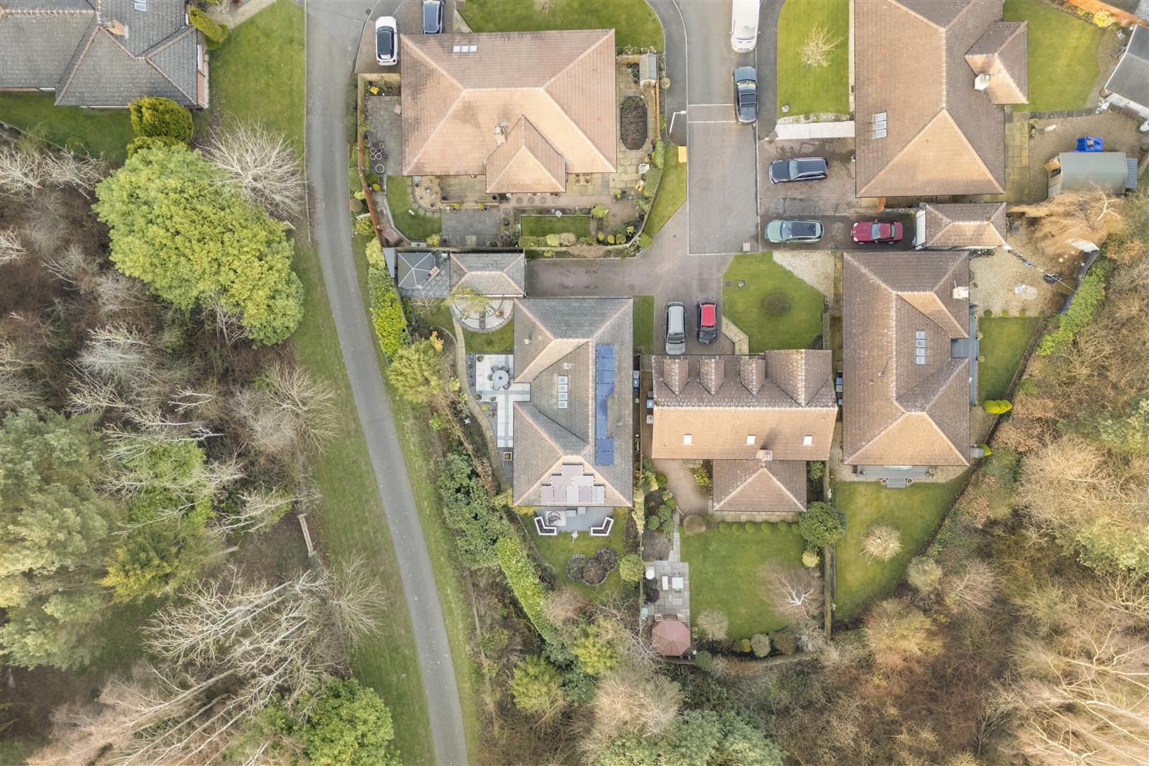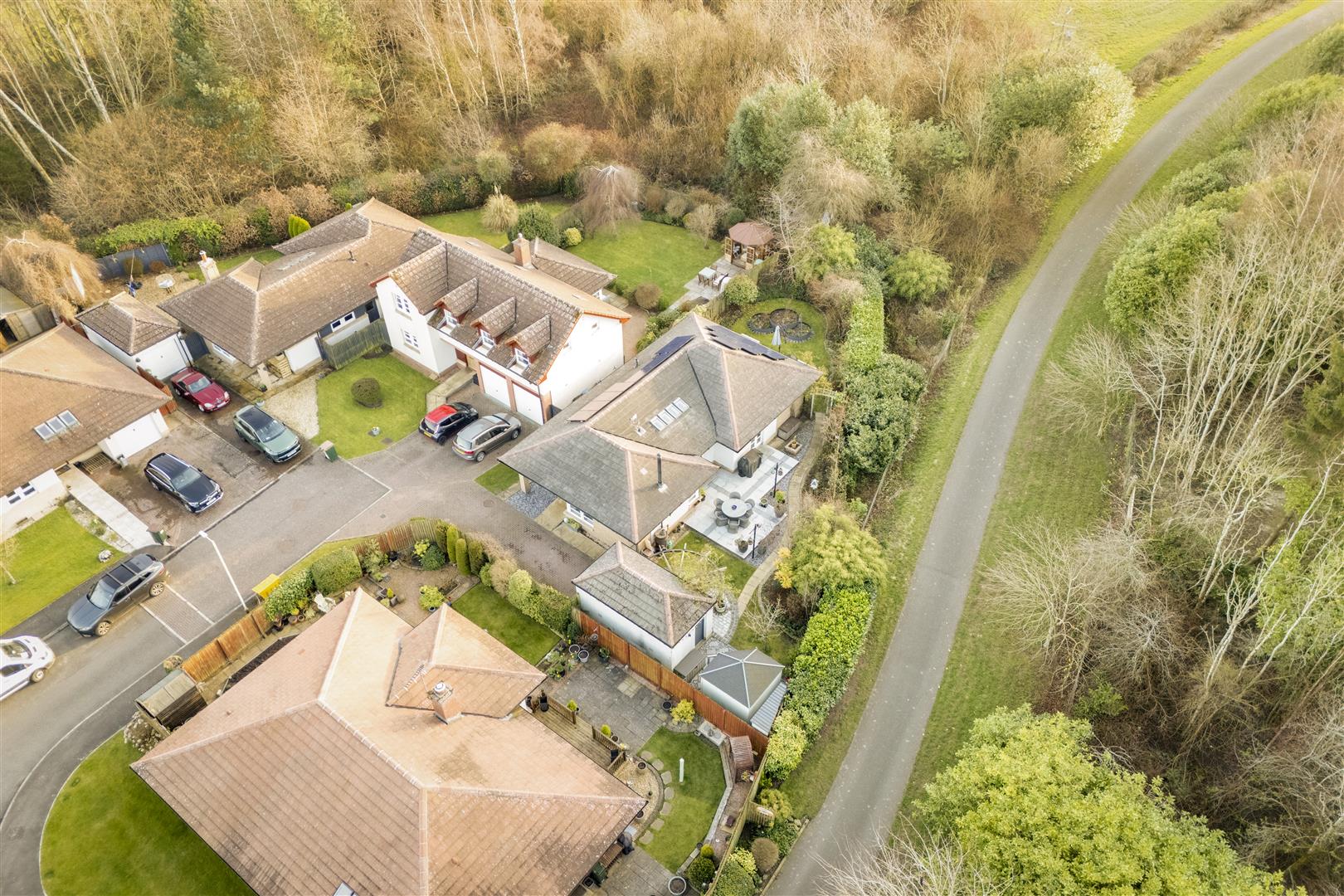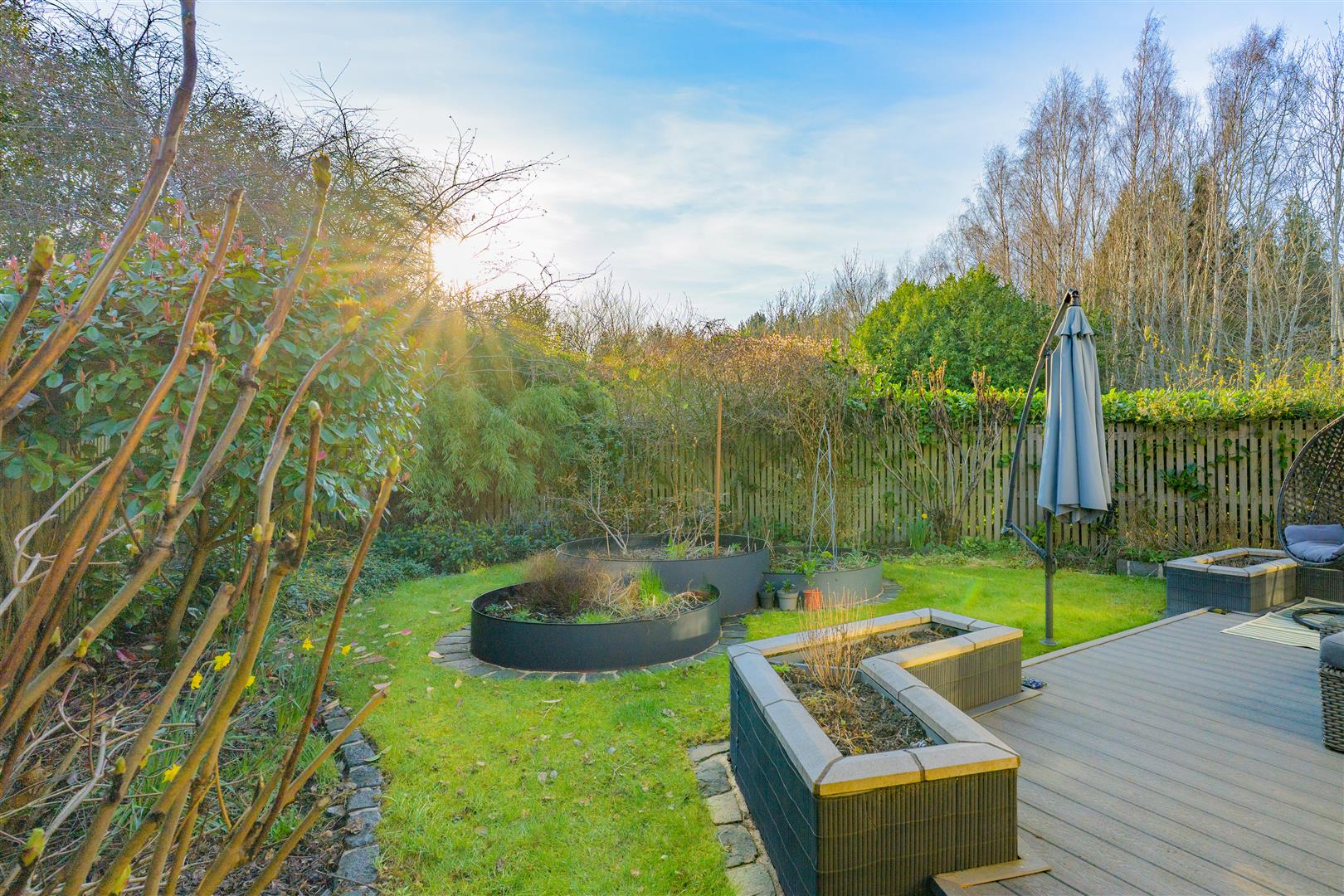 Externally, the home enjoys a 'tucked away' position, offering a high degree of privacy. The wraparound gardens are comprised of mature borders and lawn, complemented by a patio and decked area—ideal for outdoor entertaining and summer relaxation. A well-equipped summer house with power provides additional versatile space. Off-street parking is available via a driveway leading to a garage.