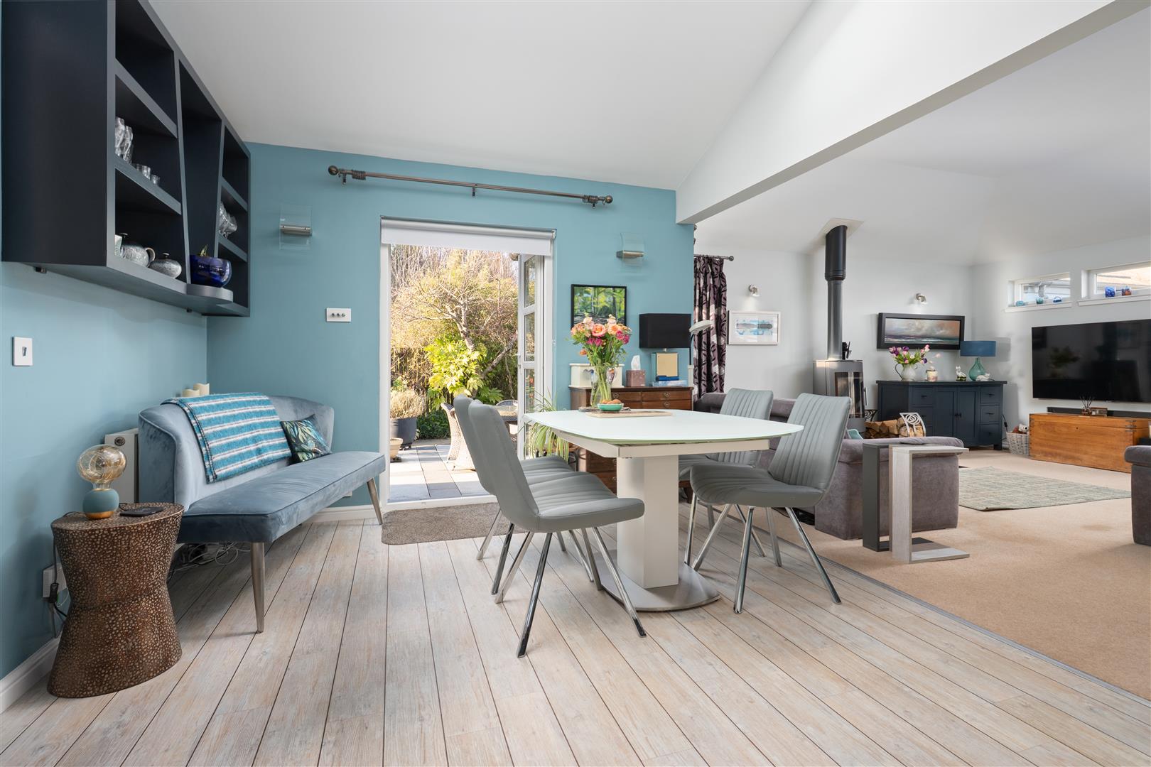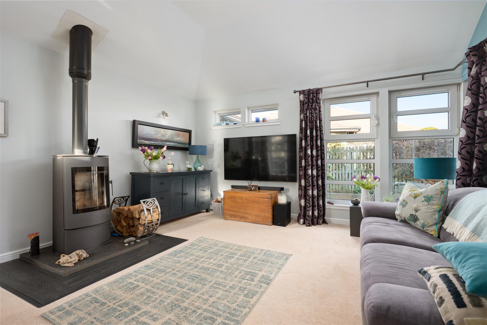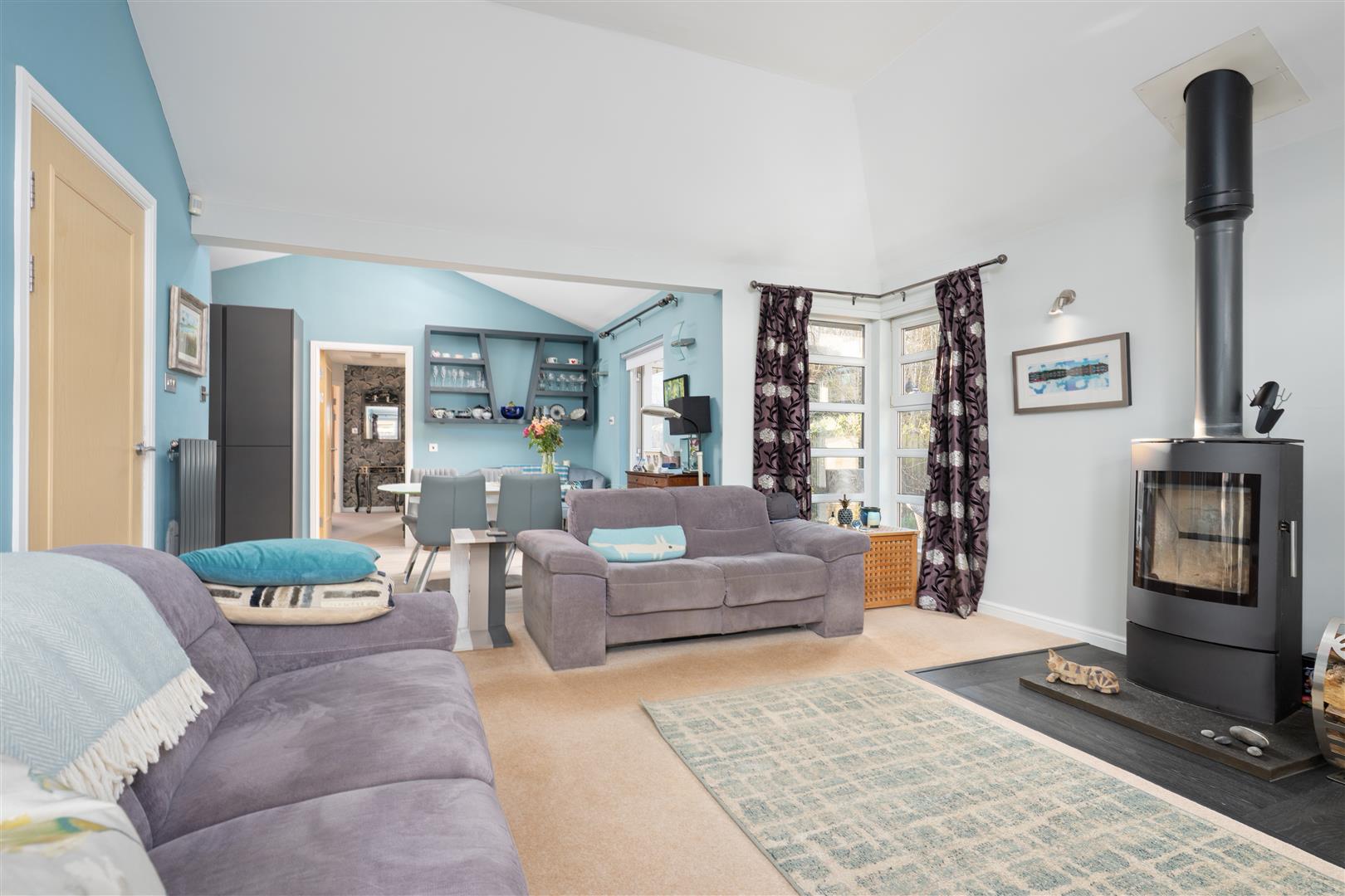 Arranged over a single level, the accommodation comprises a welcoming entrance hall, a convenient W.C., and a bright and spacious living room featuring a wood-burning stove. This space flows seamlessly into the dining area, which enjoys direct access to the garden, and a modern kitchen complete with integrated appliances. A separate utility room adds further practicality.