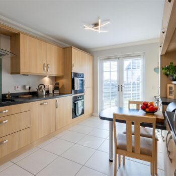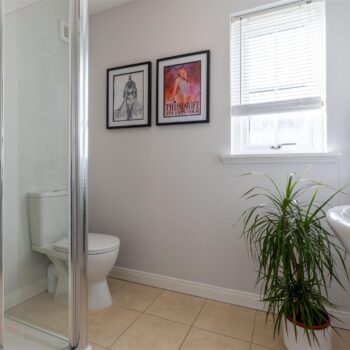 Upstairs, there are three generously sized bedrooms, with the principal bedroom benefiting from its own en-suite shower room. A modern family bathroom and excellent built-in storage complete the upper level. The property further benefits from oil-fired central heating and double glazing throughout.